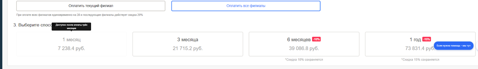Обратите внимание, при единовременной оплате сработает скидка 20% на второй и все последующие филиалы сети, дополнительно применится и скидка за продление тарифа на 6 месяц (10%) или 12 (15%) месяцев при выборе определенного периода оплаты.