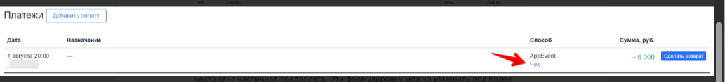 Если платёж от клиента поступил через онлайн-платежи, то в карточке заказа напротив данного платежа появится активная кнопка Чек. По клику откроется документ с чеком по данной оплате. Вы можете отправить данный документ клиенту в случае необходимости подтверждения платежа или использовать для себя.