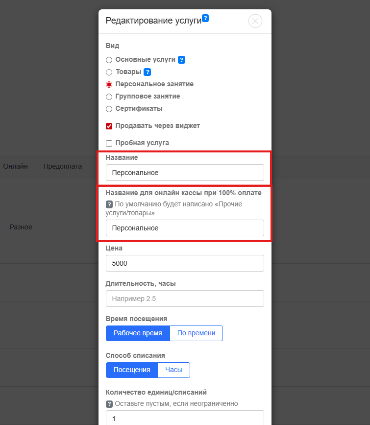 По услугам, продаваемым в разделе «Магазин» внутри виджета, формулировка для чека прописывается при создании услуги. В случае, если поле наименования не будет заполнено, в чеке будет указана формулировка «Прочие услуги/товары».