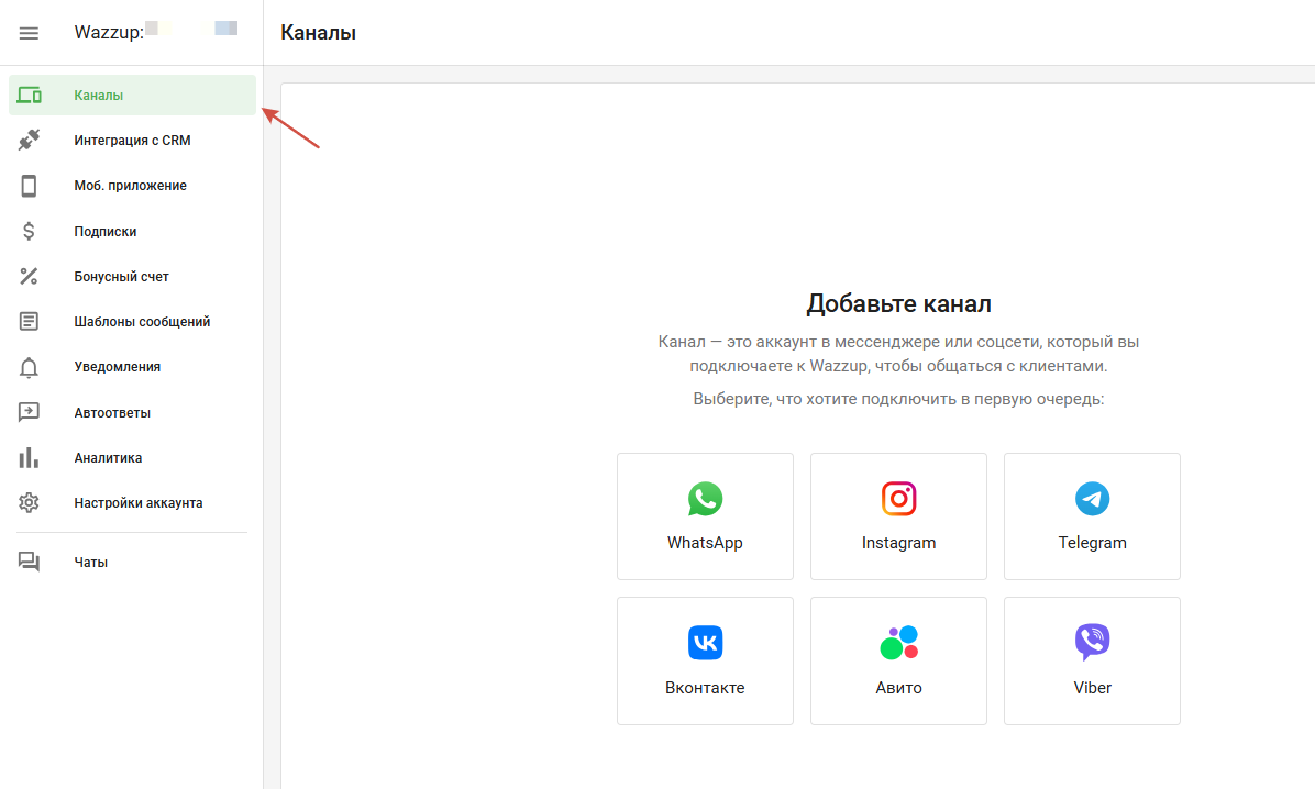 Далее создайте каналы связи. В личном кабинете Wazzup в разделе «Каналы» выберите нужный мессенджер: