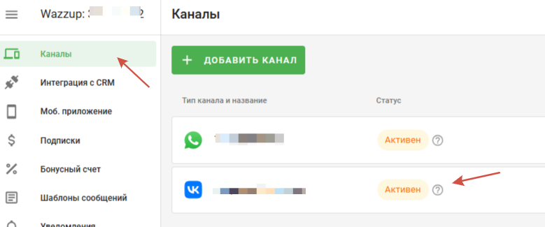 После подключения убедитесь, что напротив каждого канала отображается статус «Активен». Если возникли проблемы с подключением, обратитесь в техническую поддержку Wazzup.