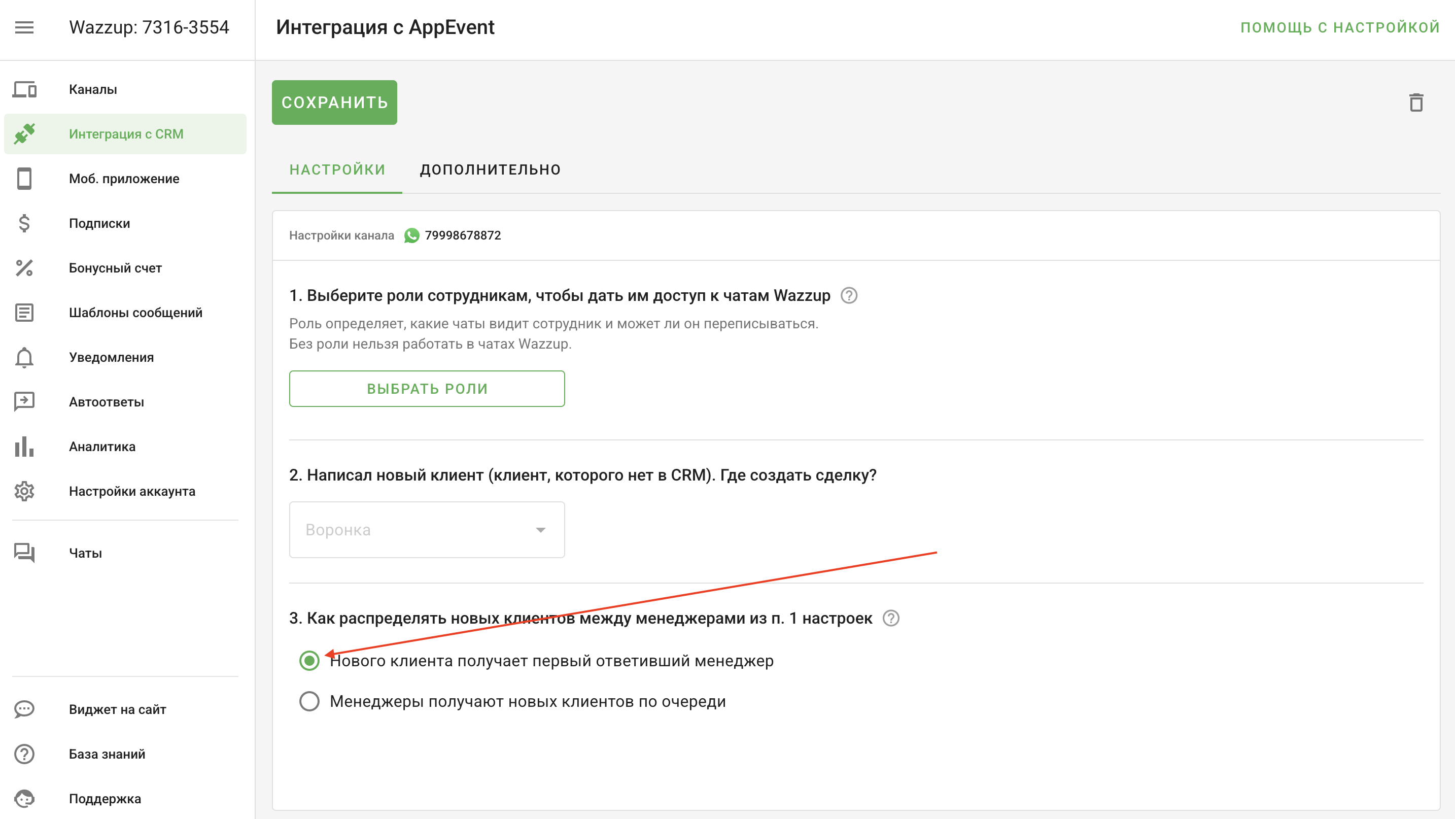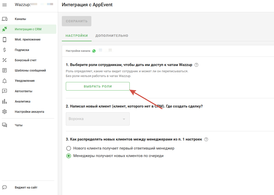 Если подключено несколько каналов (например, WhatsApp и ВКонтакте), роли и распределение нужно настроить отдельно для каждого.