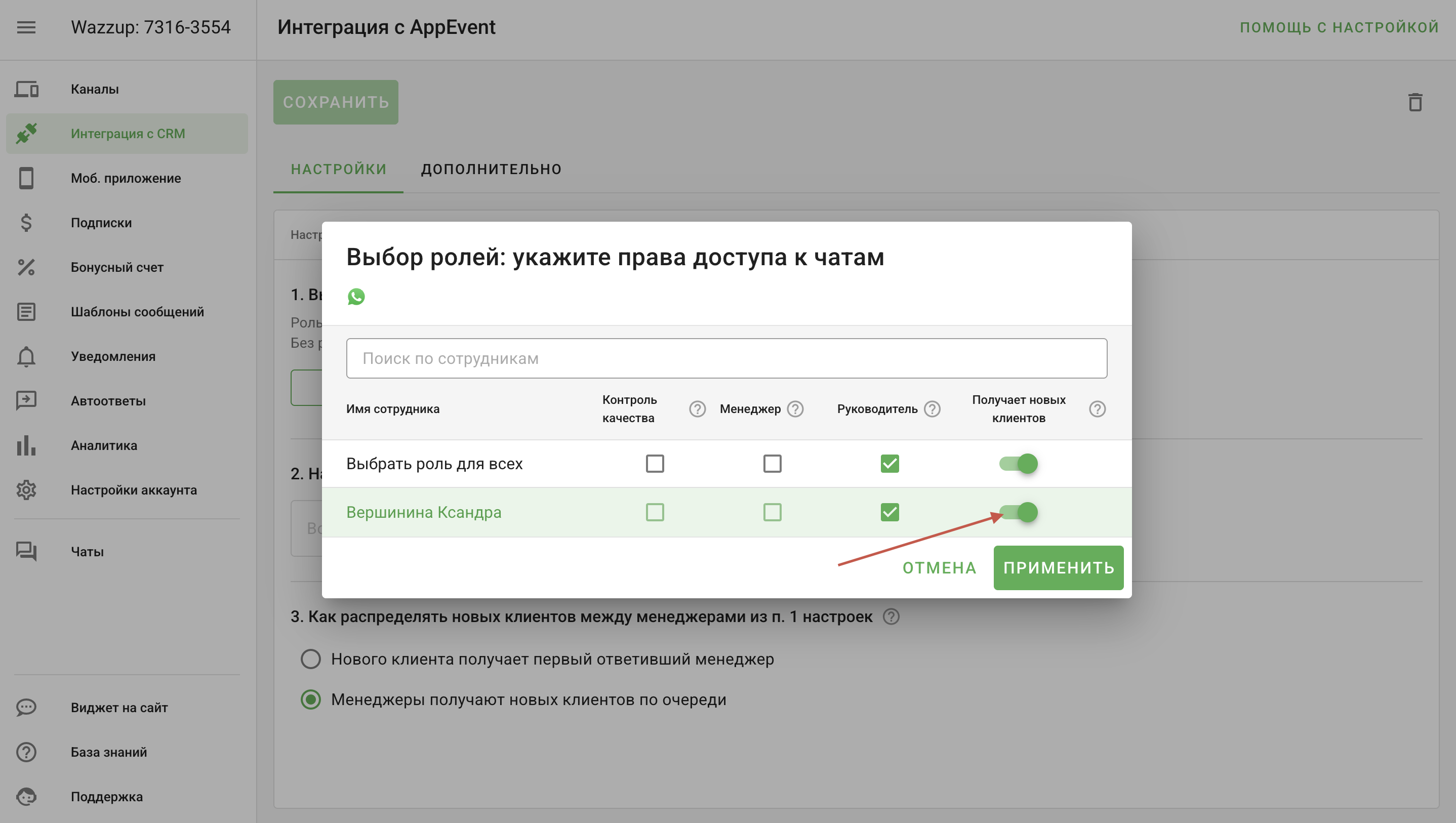 После подключения канала в личном кабинете Wazzup в разделе «Интеграция с CRM» необходимо назначить роли сотрудникам:
