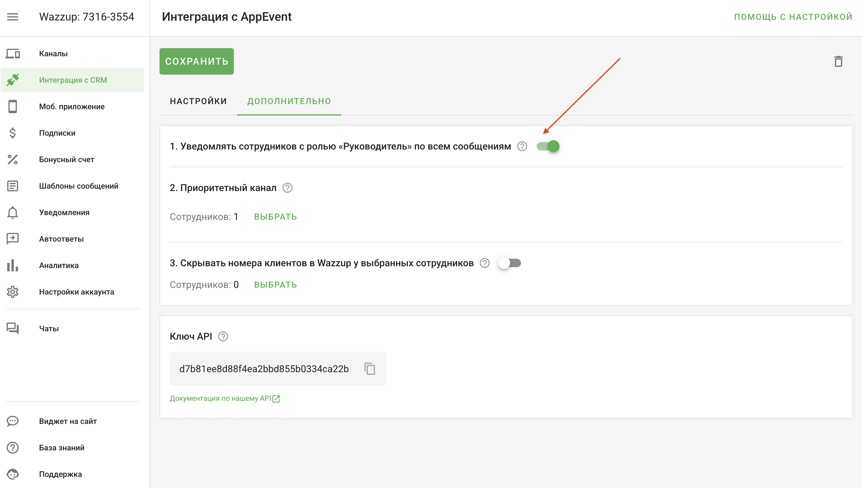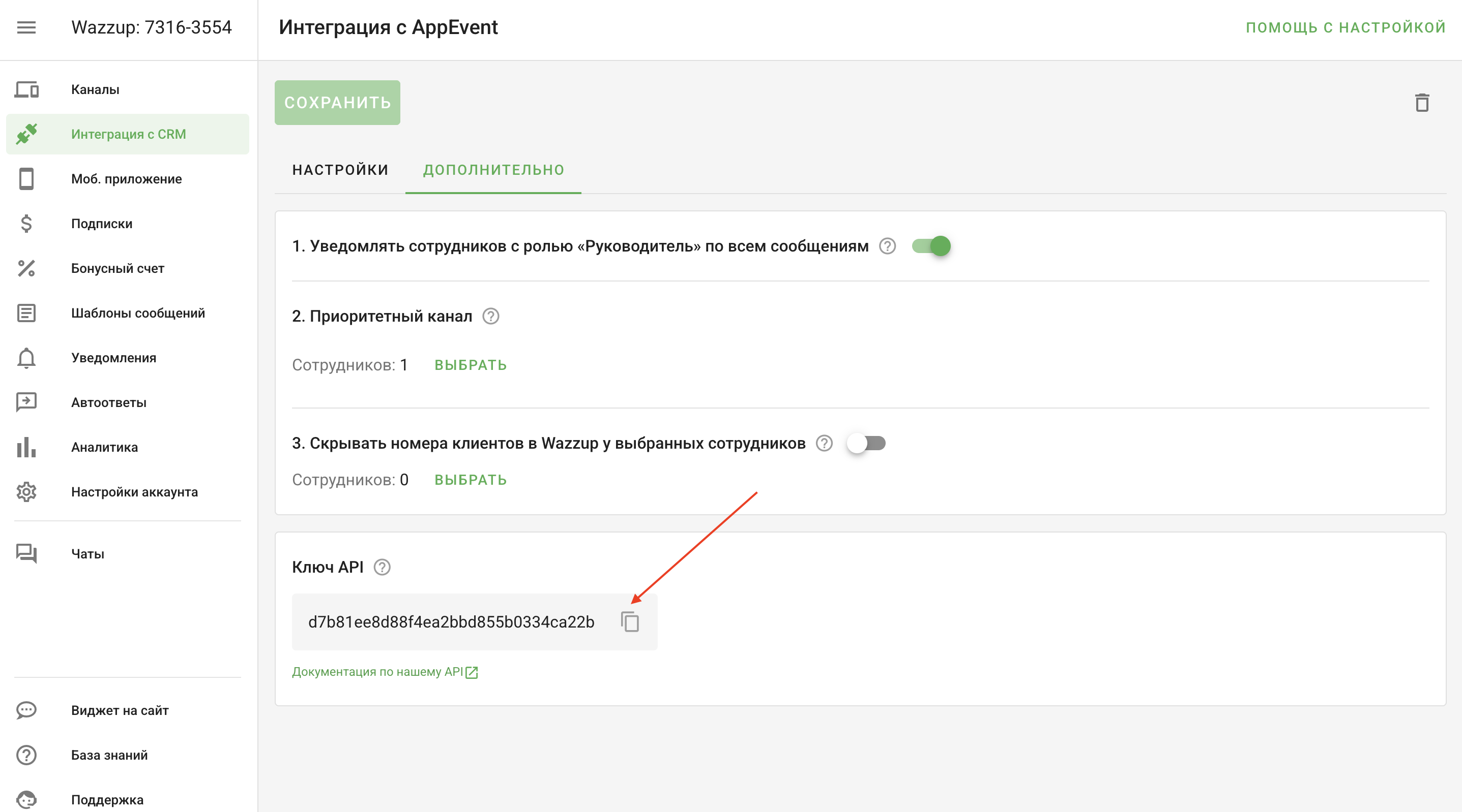 Для второго и последующих филиалов не нужно заводить новый номер и профиль — достаточно скопировать API‑ключ из личного кабинета Wazzup в разделе «Интеграция с CRM» («вкладка Дополнительно») и вставить его в системе филиала в «Профиль компании» → «Интеграции» → «Wazzup».