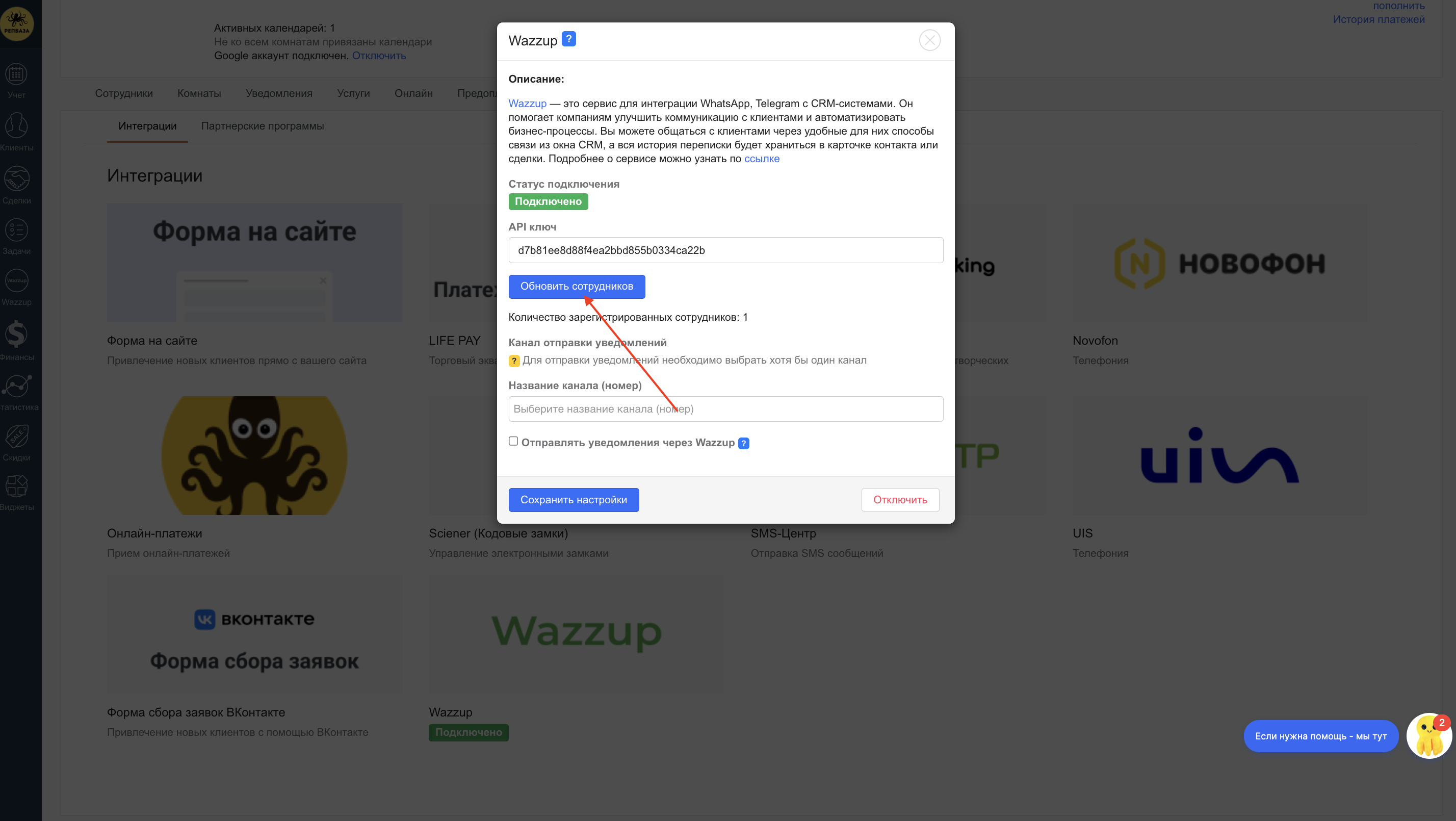 Если при подключённой интеграции вы добавляете или удаляете сотрудника в систему, необходимо обновить список сотрудников для корректной работы.