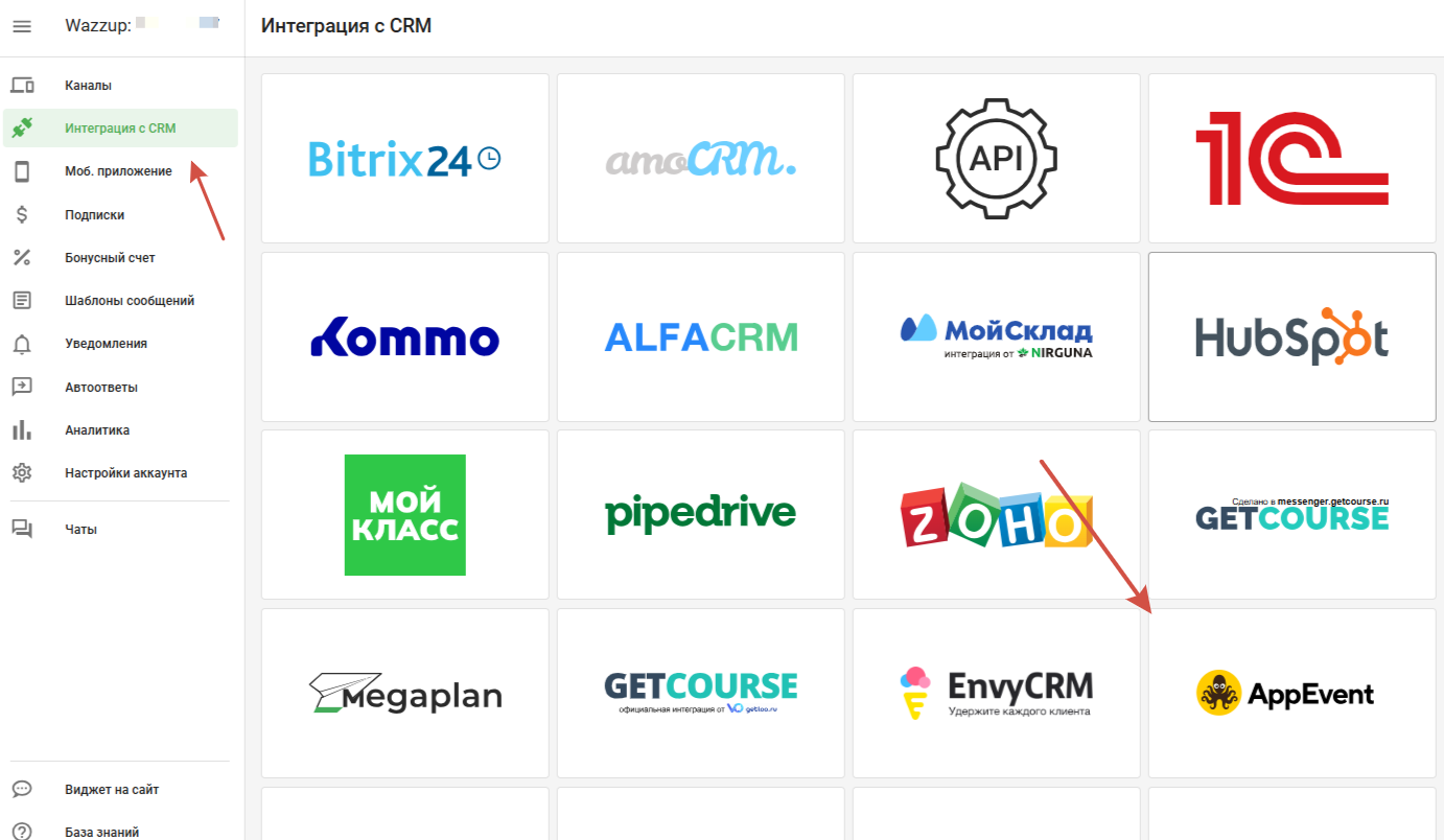 В личном кабинете Wazzup перейдите в раздел «Интеграция с CRM» и выберите способ интеграции AppEvent.