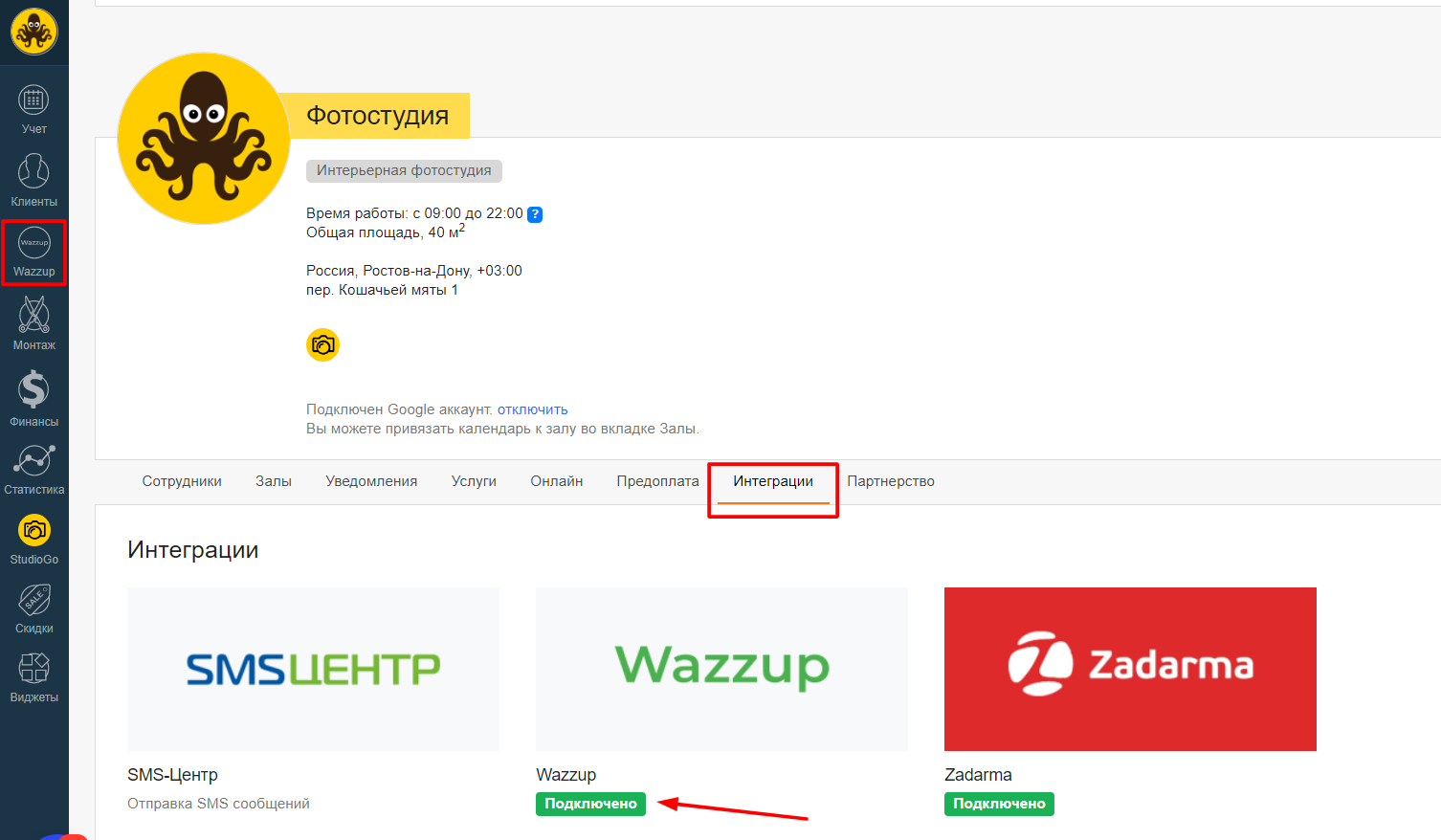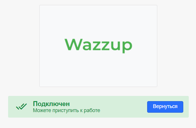 В профиле появится новый раздел Wazzup, а на вкладке «Интеграции» статус изменится на «Подключено».