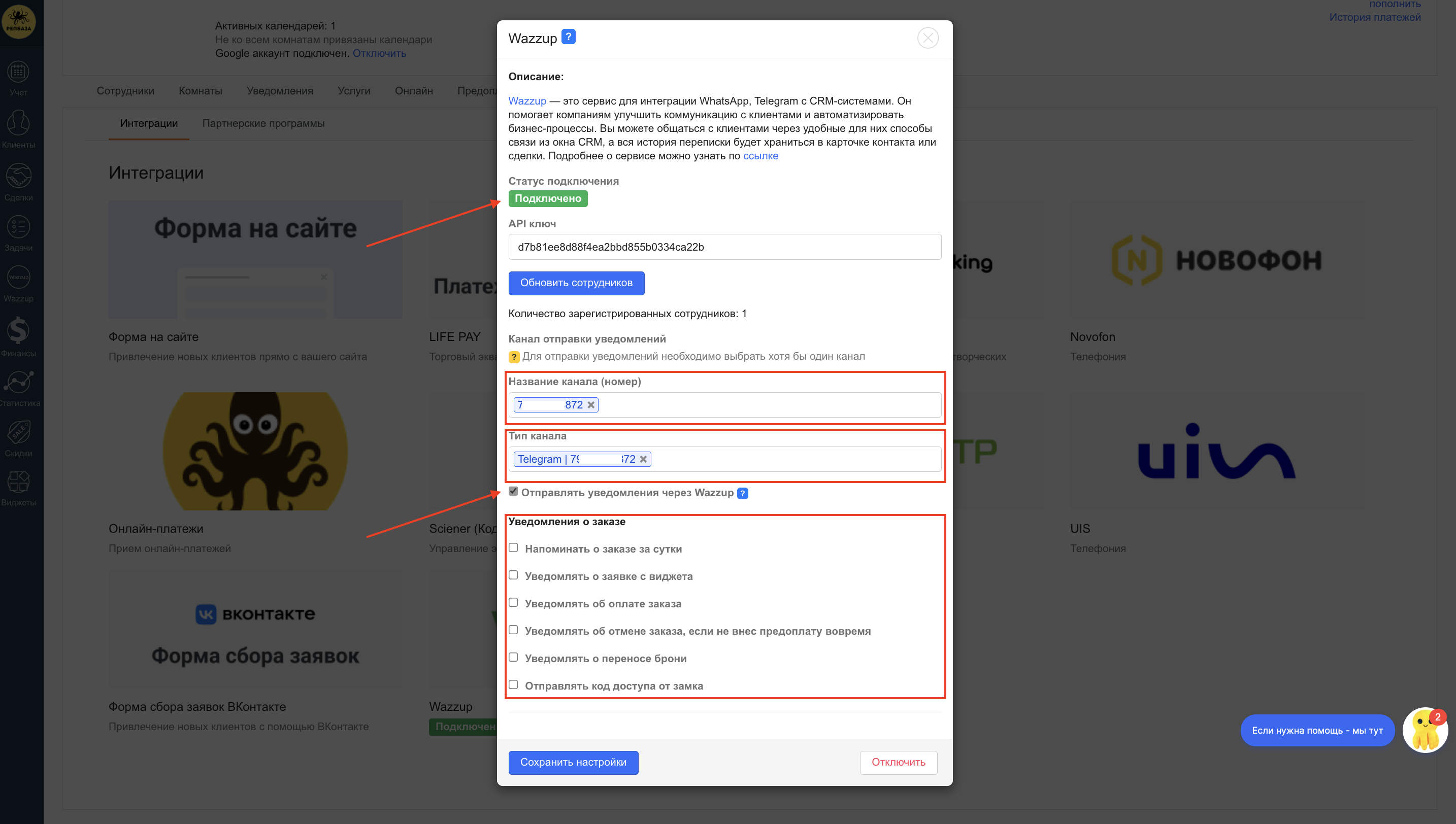 После подключения также включите нужные типы уведомлений и назначьте роли сотрудникам.