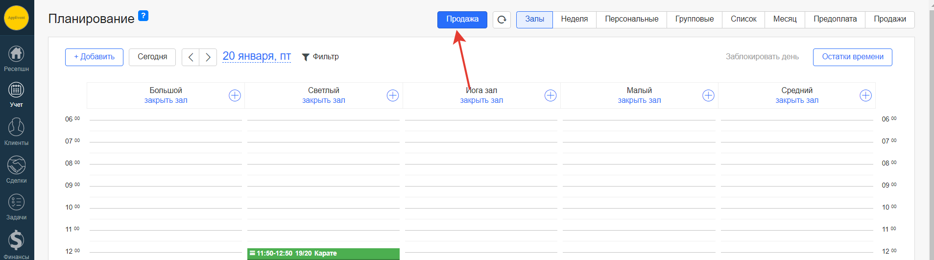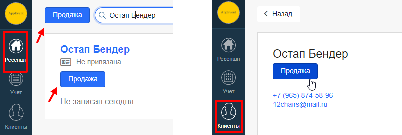 через раздел «Ресепшн» или карточку клиента по кнопке «Продажа».