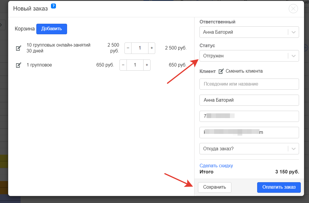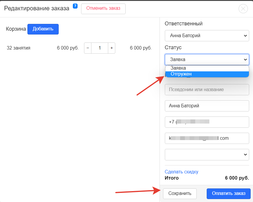 Выберите нужный абонемент или услугу и установите статус заказа «Отгружен».