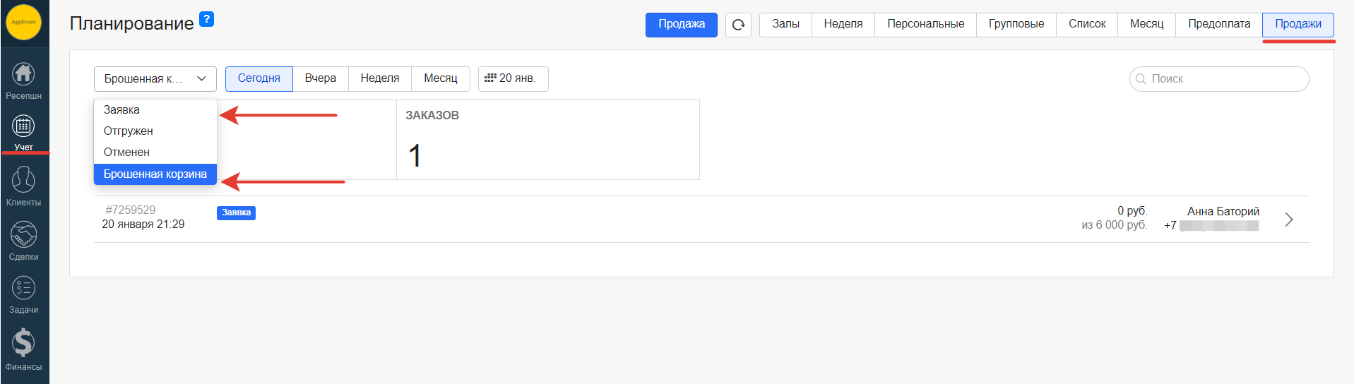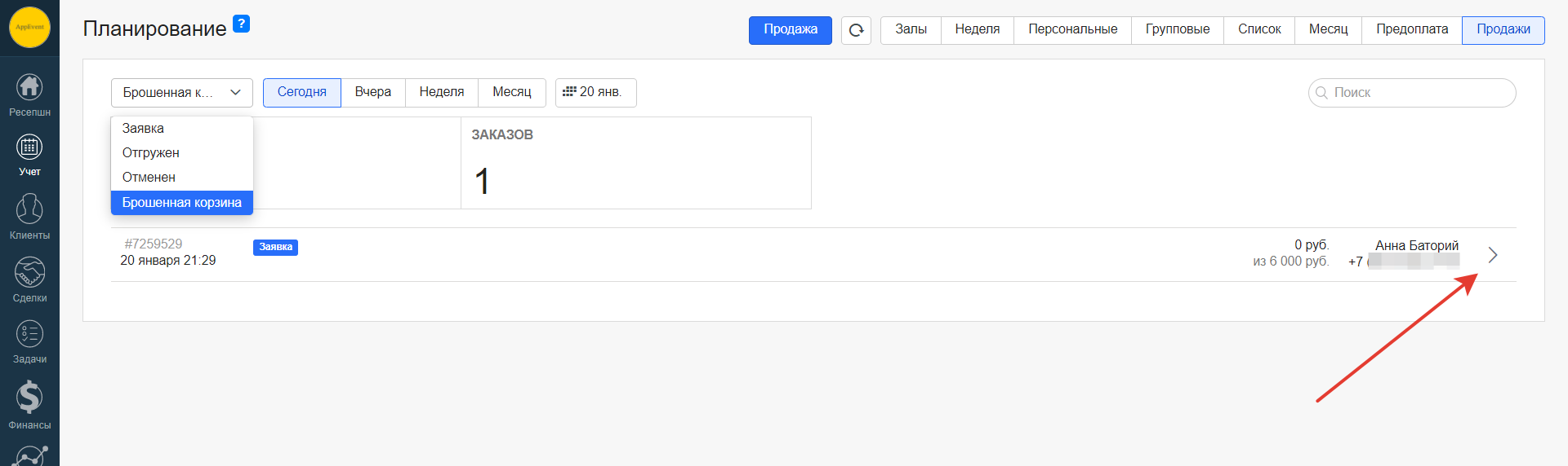 «Учёт» → «Продажи» → фильтр: «Заявка» или «Брошенная корзина».