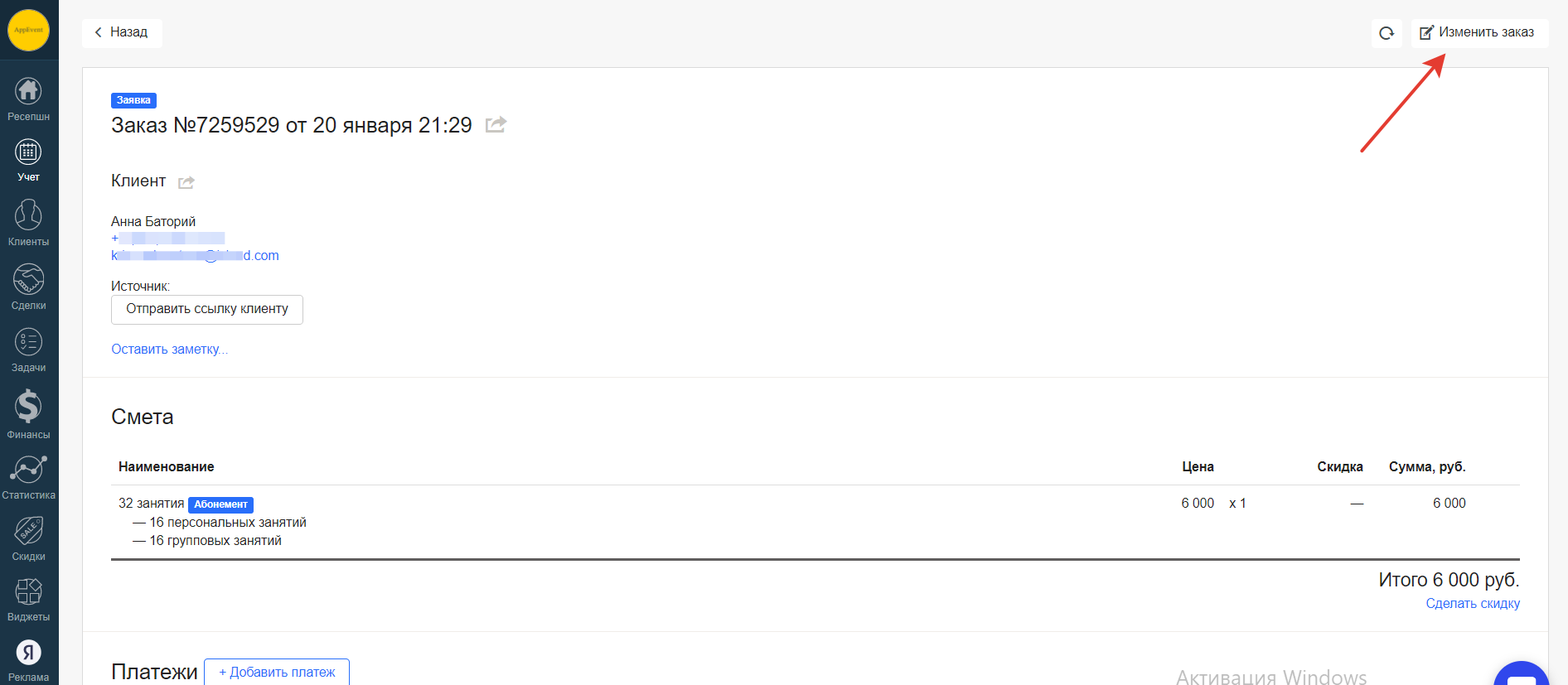 Теперь у клиента есть действующий абонемент, который он может использовать сразу. Оплата по заказу пока отсутствует — её можно внести позже.