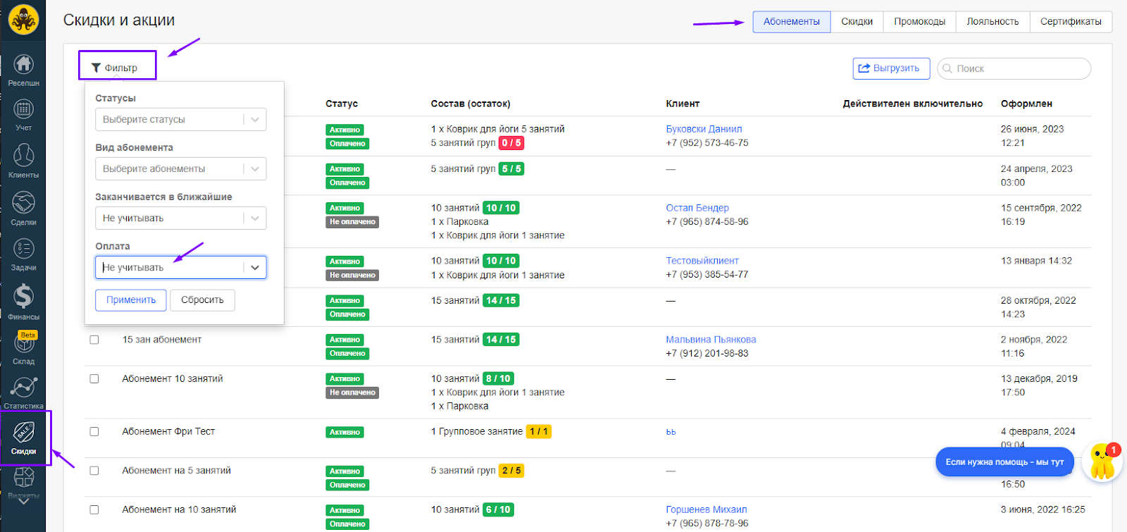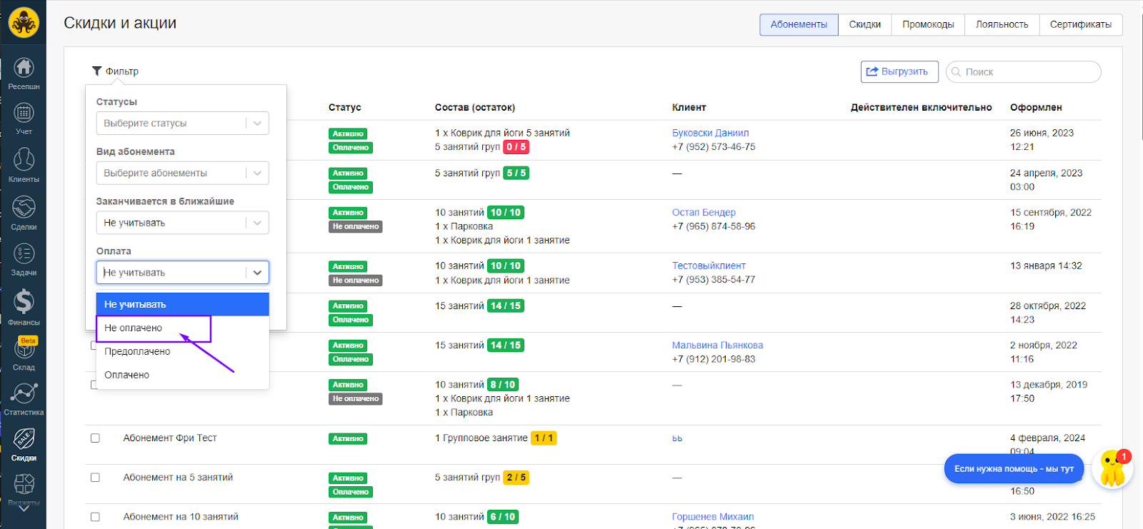 «Скидки» → «Абонементы» → фильтр «Оплата» → «Не оплачено».