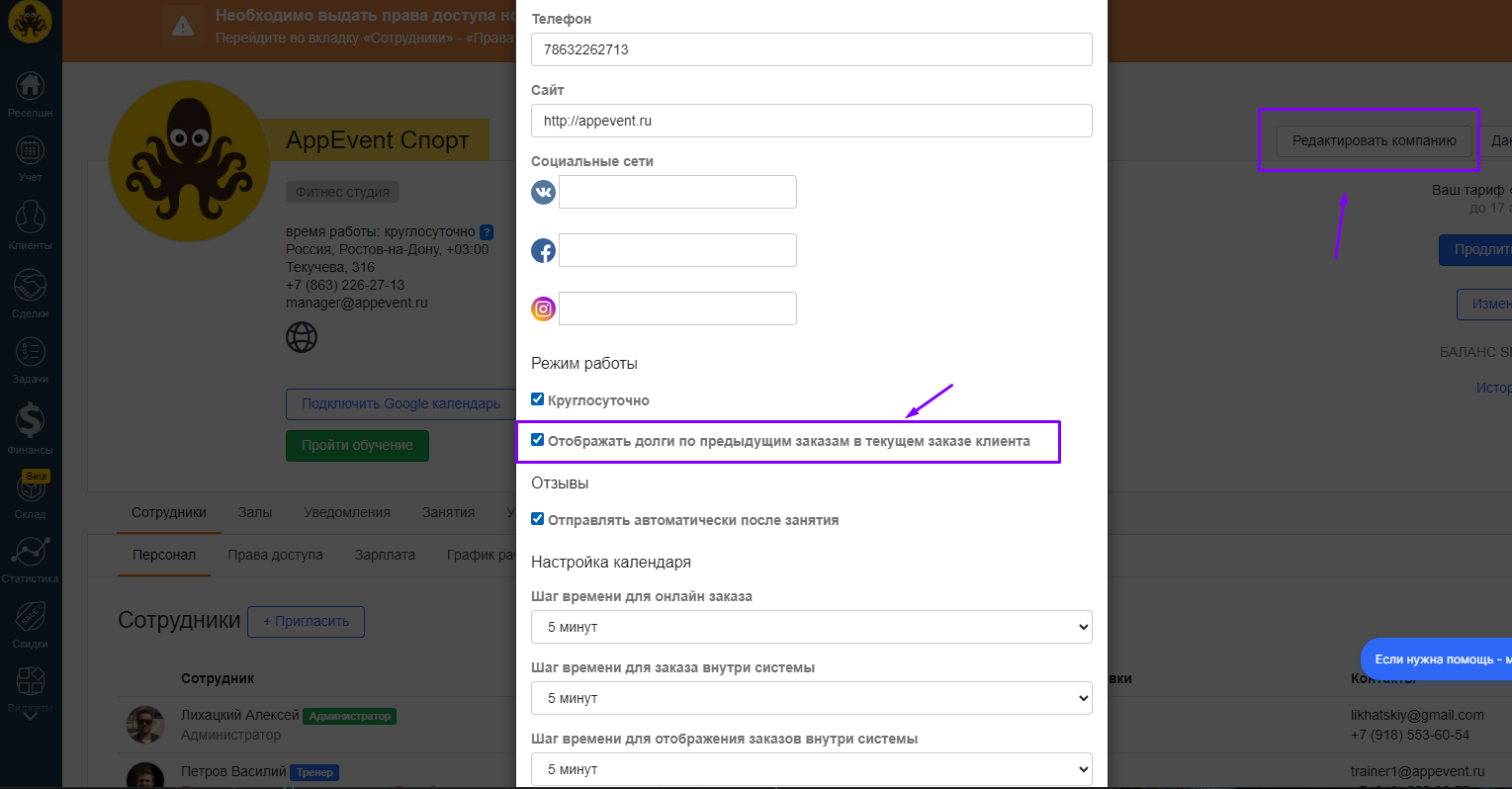Важно: Настройка «Отображать долги по предыдущим заказам в текущем заказе клиента» работает только для заказов аренды, созданных сотрудником внутри системы.
