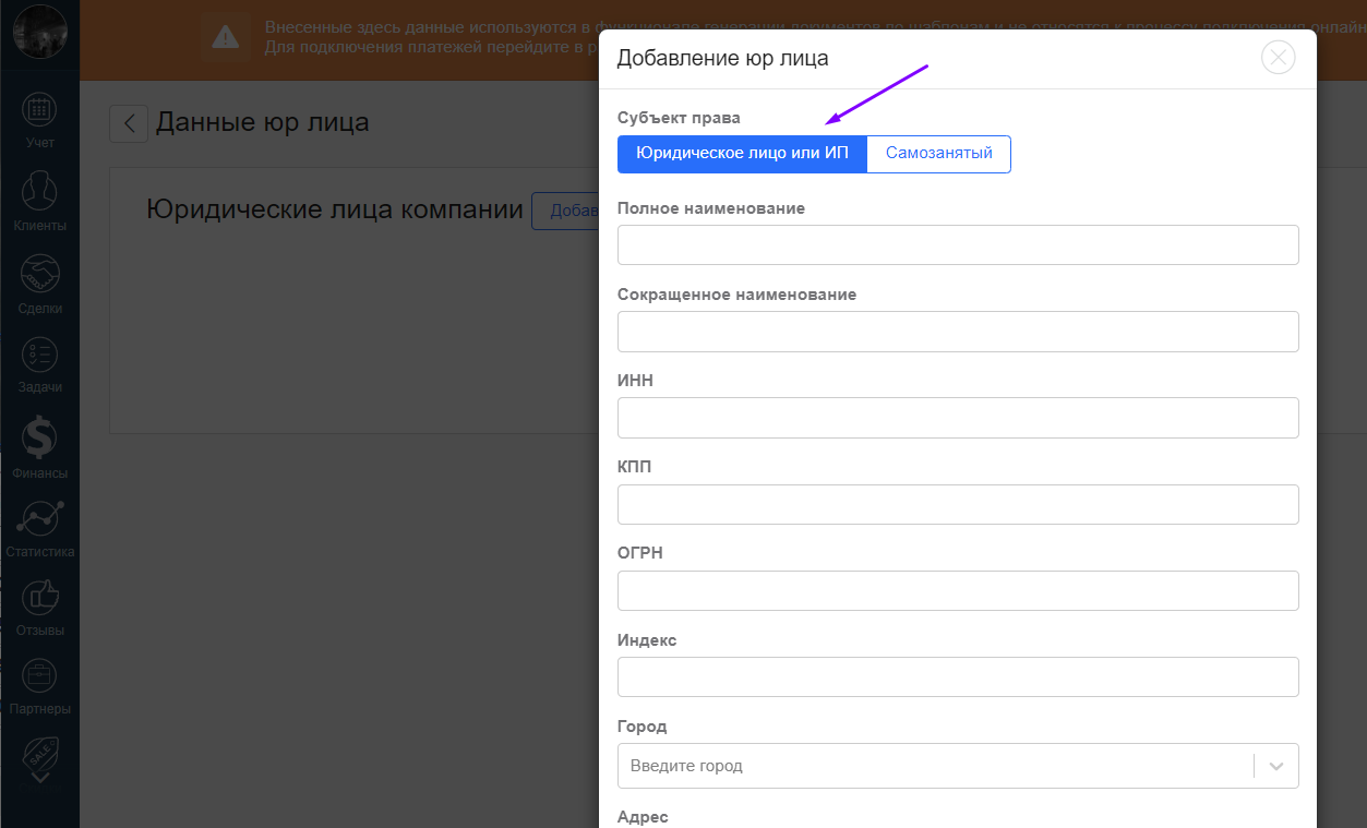 В открывшемся окне в разделе "Субъект права" выбираем нужную правовую форму для заполнения "Юридическое лицо или ИП" или же "Самозанятый". После чего заполняем форму данными вашего юридического лица.
