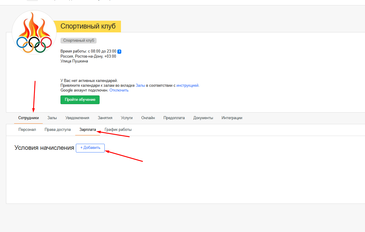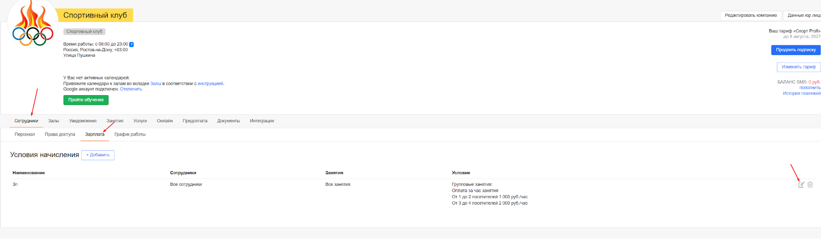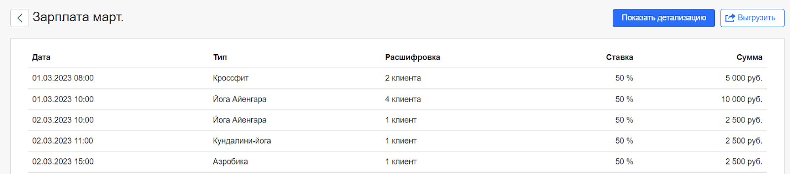 Пример: зарплата настроена как 100 рублей за каждого пришедшего клиента, на занятие записано 9 клиентов, пришло 5, таким образом оплата преподавателю за данную тренировку составит 500 рублей.