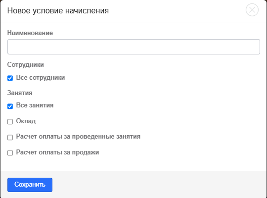 «Занятия» - здесь можно выбрать к какому именно занятию будет примениться настраиваемая зарплата. Если зарплата будет примениться по всем занятиям, то оставьте галочку возле «Все занятия». Как создать занятие внутри системы, можно ознакомиться в данной статье..