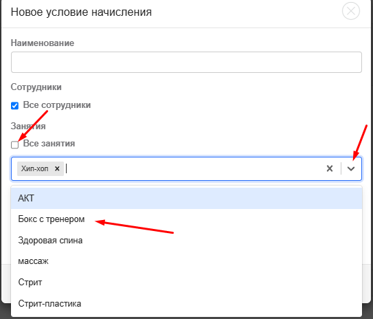 При настройке зарплаты с учетом не всех, а конкретных занятий, вы сможете выбрать как одно, так и нескольких значений из списка.