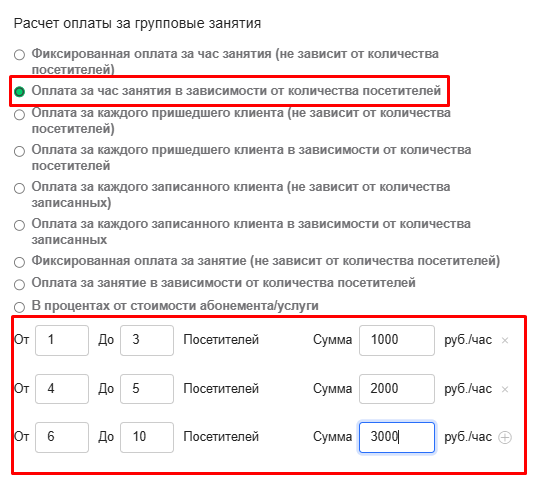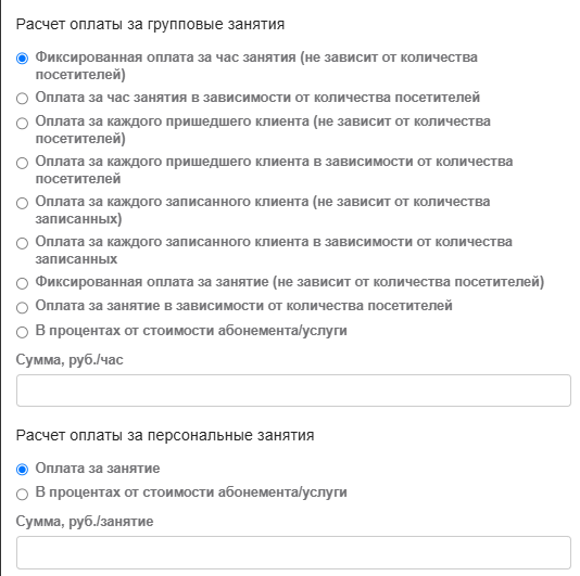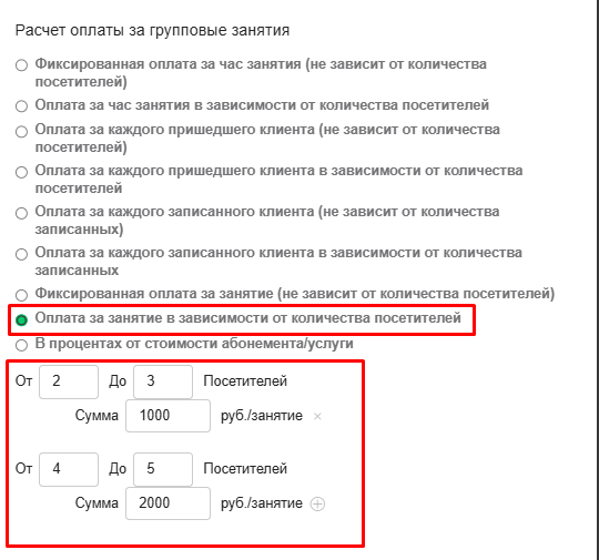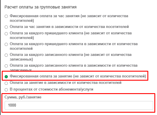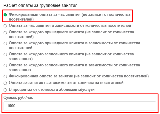 2.7 «Фиксированная оплата за занятие (не зависит от количества посетителей)» - с этой настройкой зарплата преподавателя будет считаться за занятие, независимо пришли клиенты на него или на занятия вообще не записались.