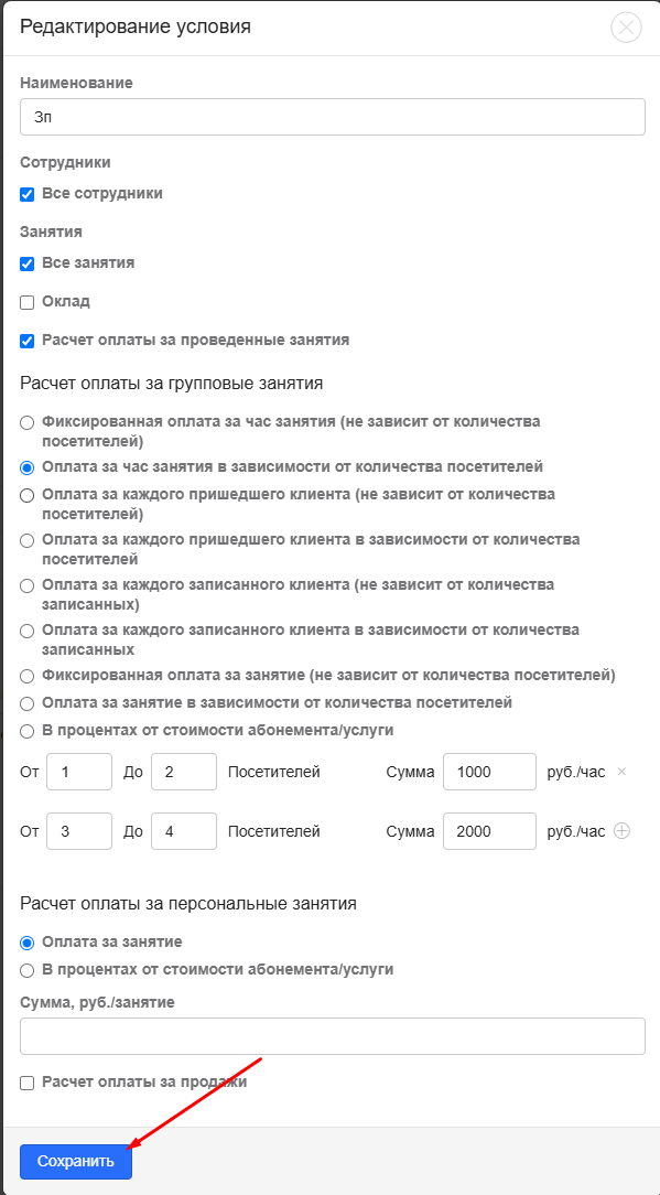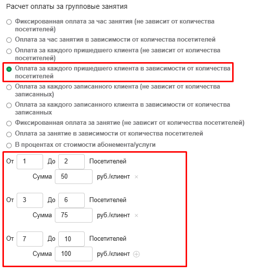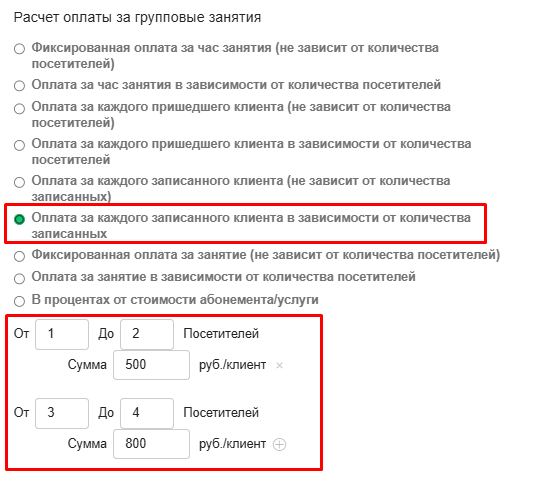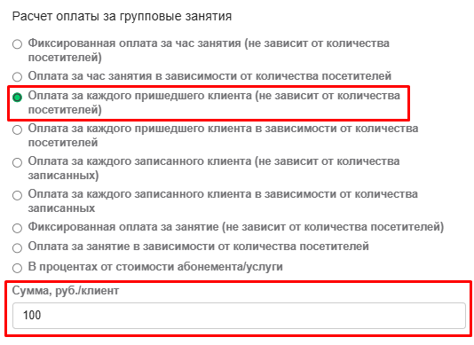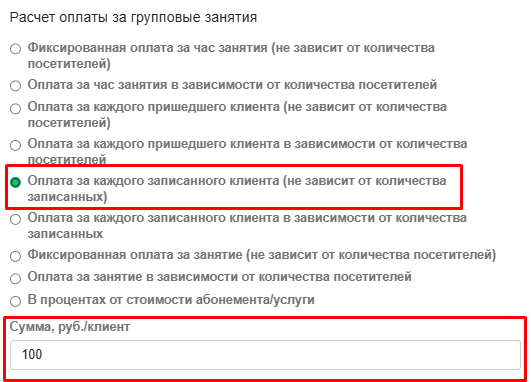 2.5 «Оплата за каждого записанного клиента (не зависит от количества записанных)» - при данной настройке зарплаты, оплата будет за всех записавшихся клиентов, независимо проставлено посещение или нет.