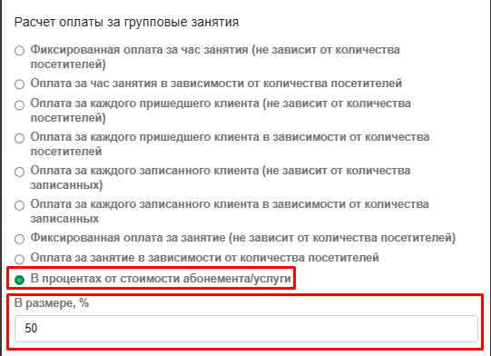Пример: в настройке указали оплату в размере 50% от стоимости абонемента/услуги, на занятие пришел клиент у которого в наличии абонемент/услуга на 8 занятий и цена 4000 рублей, в таком случае преподаватель получит 50% от стоимости 1 занятия в данном абонементе/услуге, так как 1 занятие в данном абонементе/услуге стоит 500 рублей, то преподаватель получит половину 250 рублей.