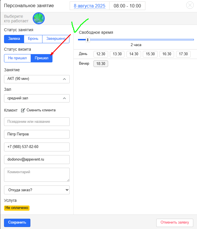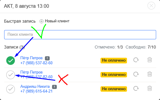 Обратите внимание, для того чтобы оплата за занятие зачлась, нужно в персональное занятие проставить что клиент пришел.