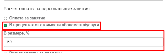 2.9 «В процентах от стоимости абонемента/услуги» - при данной настройке зарплаты, оплата будет рассчитываться от стоимости абонемента/услуги и количества занятий в нем.