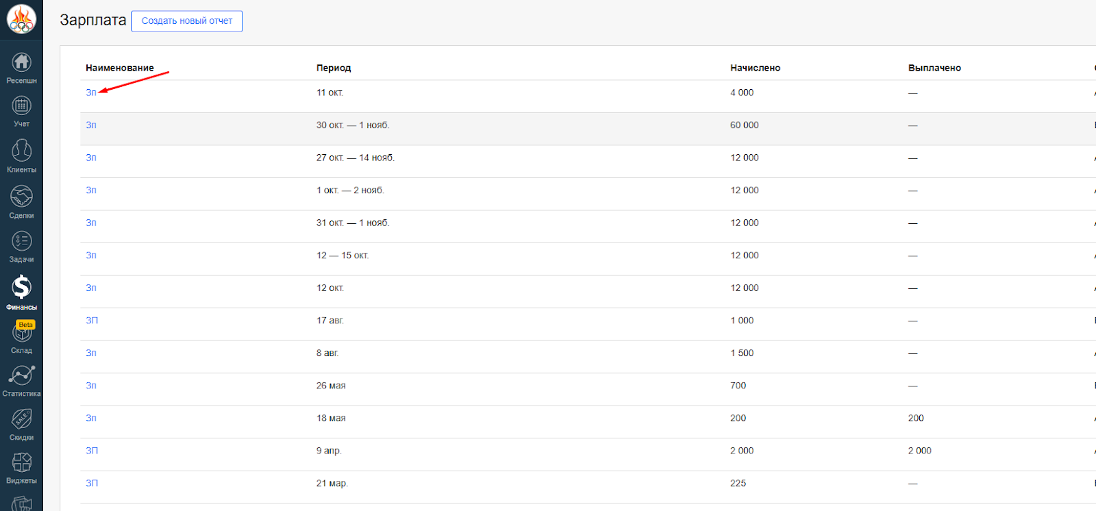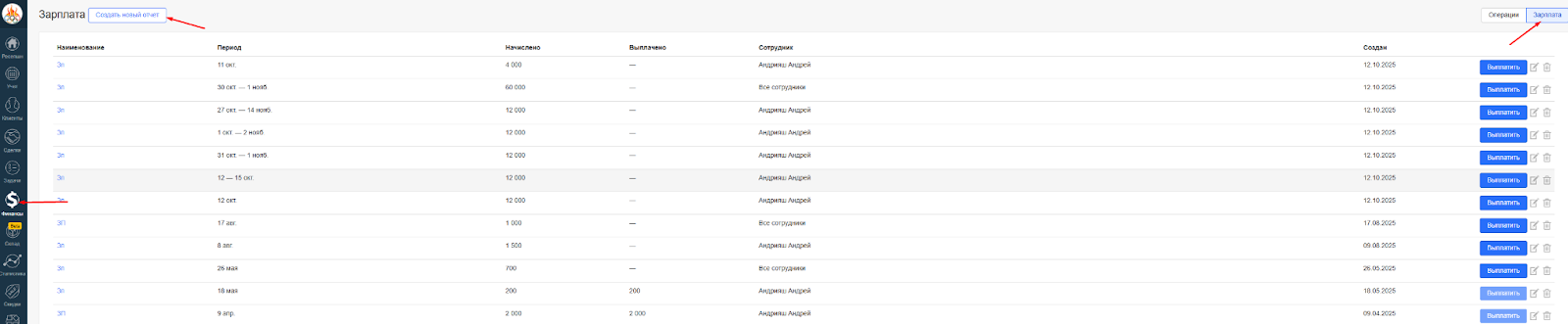 Чтобы создать отчет по настроенной зарплате, перейдите в раздел «Финансы» → «Зарплата» и нажмите на кнопку «Создать отчет».