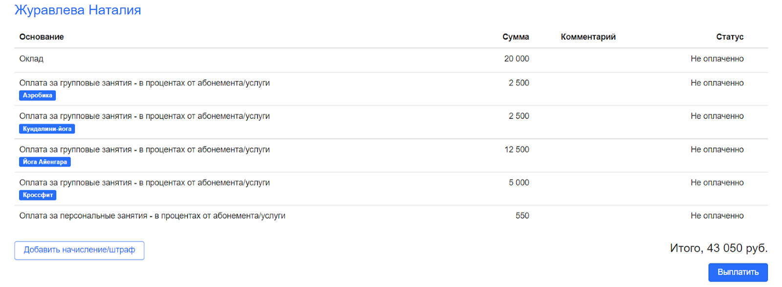 Пример: в настройках зарплаты указано, что от продажи абонементов/услуг преподаватель получает 30% от стоимости абонемента/услуги, клиент приобрел абонемент за 15000 рублей, с этих 15 тысяч рублей преподаватель получит 5 тысяч рублей.