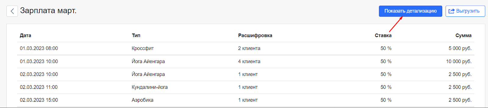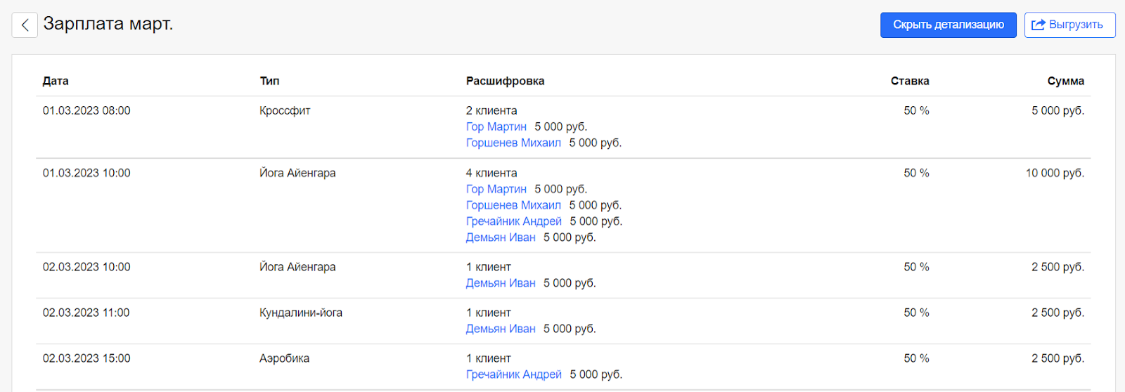При нажатии на кнопку «Показать детализацию», у вас откроется подробный отчет по каждому занятию с указанием клиентов, которые на этих занятиях присутствовали и стоимостью их абонементов. По клику на ФИО клиента вы сможете перейти в его карточку.