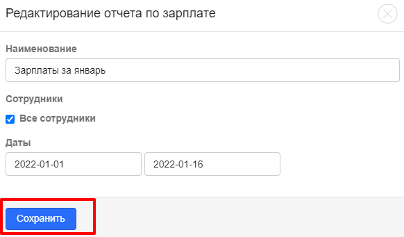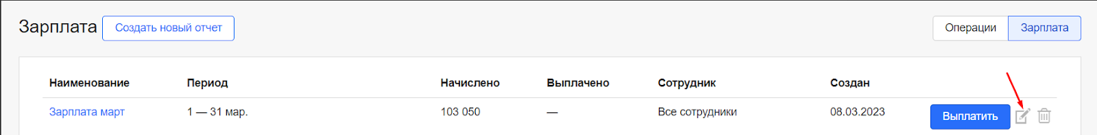В случае, если вы изменили условия начисления зарплат, и вам надо обновить отчёт, нажмите на кнопку его редактирования, а затем на кнопку сохранения - система автоматически пересчитает зарплаты.