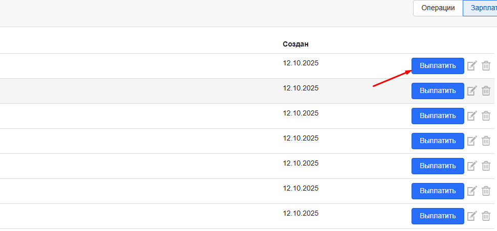 Для фиксации выплаты сотруднику зарплаты в разделе «Финансы» нажмите на кнопку «Выплатить».
