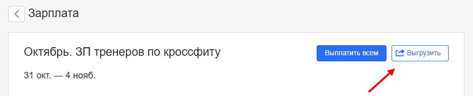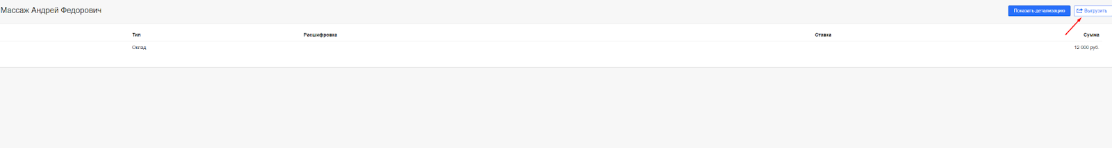 Если требуется выгрузка по конкретному сотруднику, тогда нужно зайти в отчет, после чего нажать на ФИ сотрудника, как только попадаем в расчет зарплаты конкретного сотрудника, там также будет кнопка «Выгрузить».