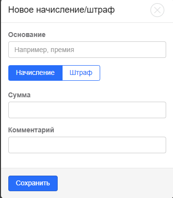 Перейдя в отчет, каждому сотруднику можно внести дополнительно оплату в виде штрафа или премию по кнопке «Добавить начисление/штраф». В открывшемся окне можно будет выбрать будет ли это штраф или премия, также потребуется указать название данной статьи платежа и указать сумму, которую требуется премировать или взыскать. Также в комментариях можно указать причину.