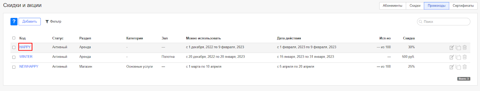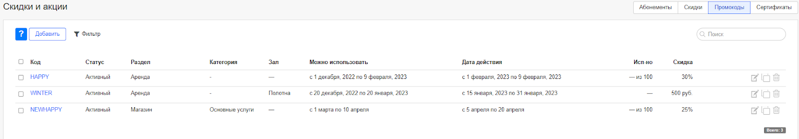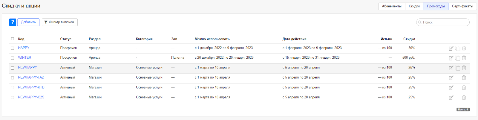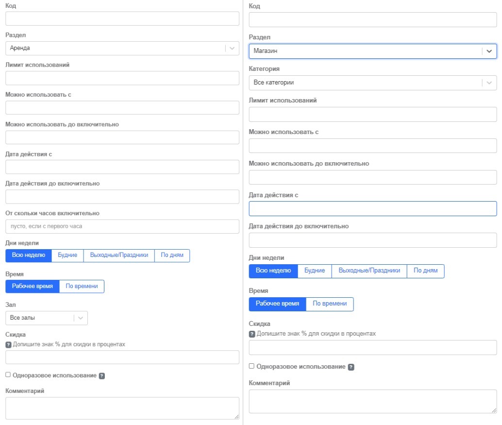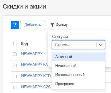 В этом разделе настраиваются все типы скидок, включая промокоды.