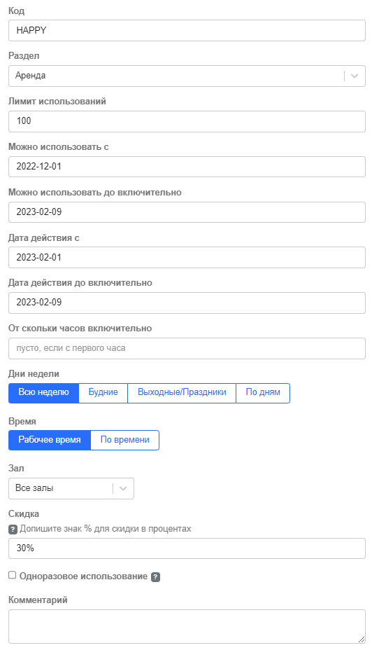 Задача: вы хотите порадовать клиентов новогодней акцией и дать им скидку 30% на аренду залов в начале февраля. Промокод будет действовать на заказы с 1 по 9 февраля, а раздавать его вы начнете заранее — с 1 по 31 декабря. Чтобы контролировать количество использований, вы ограничиваете его 100 применениями.