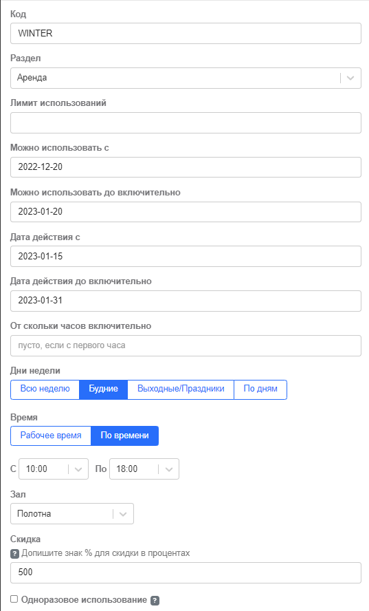 Задача: вы хотите продвигать зал «Полотна» в дневное время в январе, когда он менее загружен. Для этого создаете промокод, который дает скидку 500 ₽ и действует только по будням с 10:00 до 18:00. Промокод будет активен на заказы с 15 по 31 января. Раздавать его будете весь декабрь, а использовать данный промокод при заказе клиенты могут с 20 декабря по 20 января. Количество применений не ограничиваете — пусть пользуются все, кто подходит по условиям.