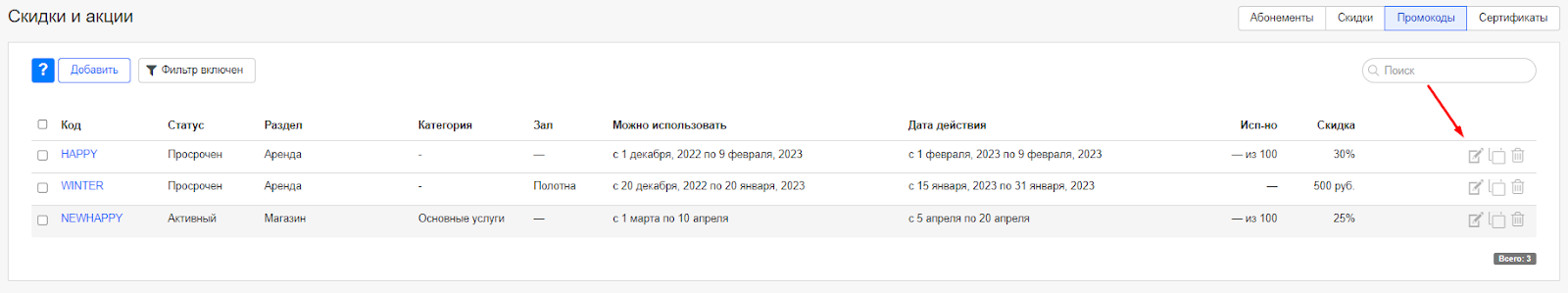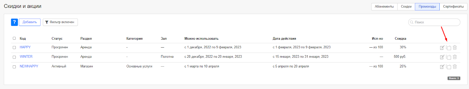 Откройте раздел «Скидки» → вкладка «Промокоды».