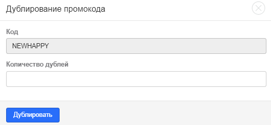 Вы можете дублировать созданный промокод и выбрать количество дублей. Это удобно, если вы создаете промокоды с похожими настройками — не нужно заполнять все вручную.