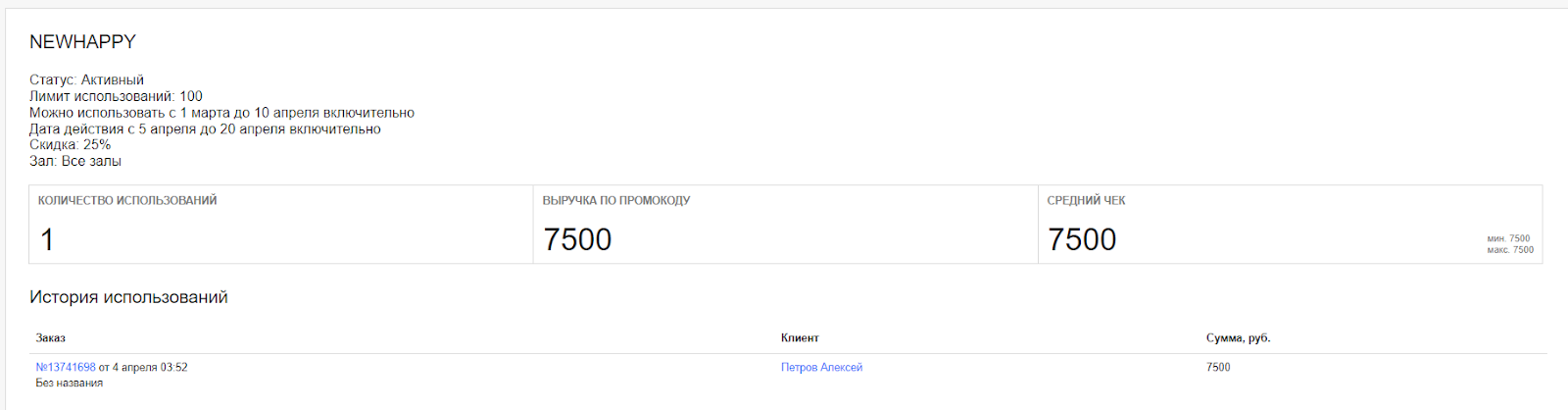 У промокода HAPPY задан лимит 100 штук. После 100 использований, даже если срок действия еще не истечет, промокод станет недоступен.
