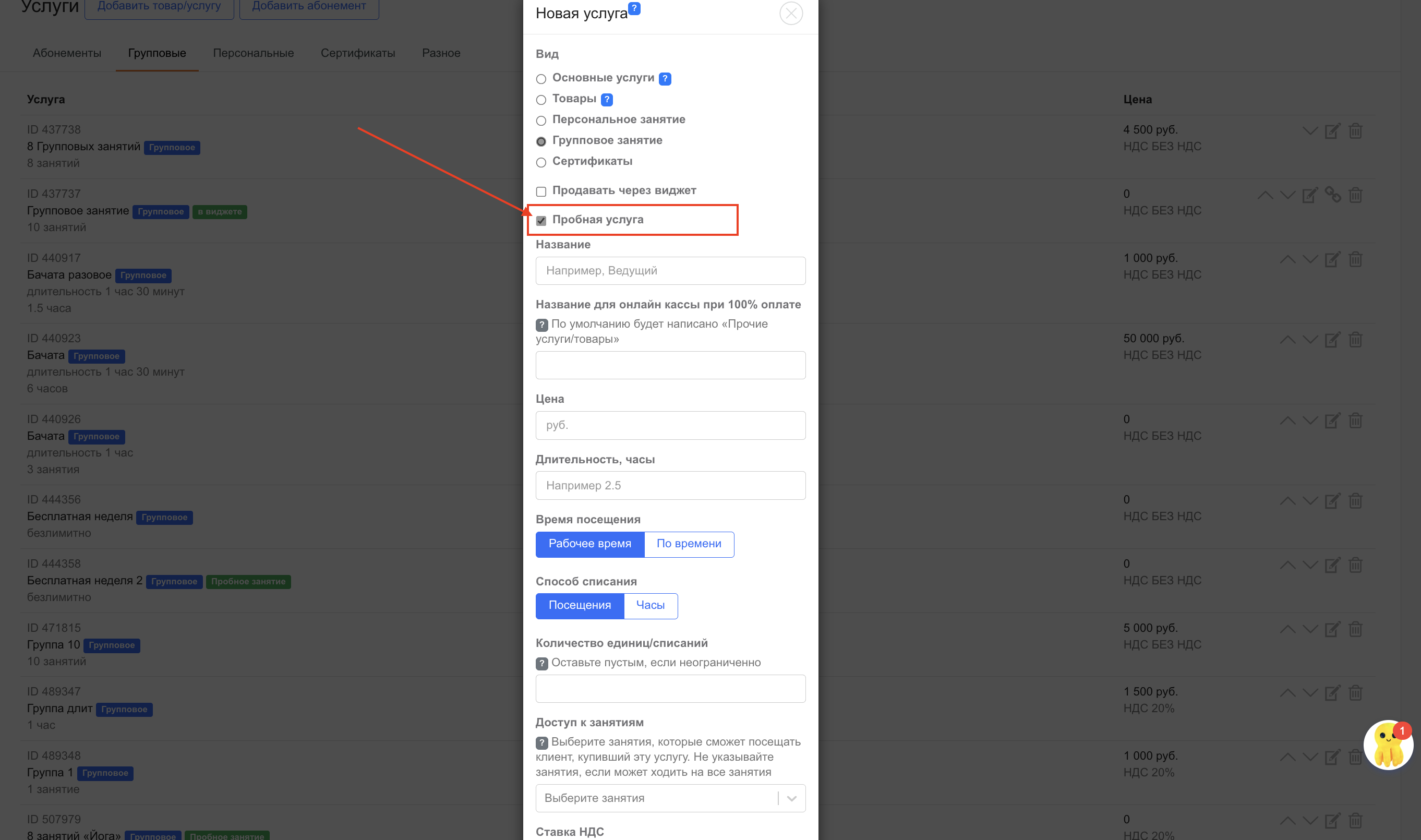 Установите галочку «Пробная услуга» — она делает абонемент пробным.