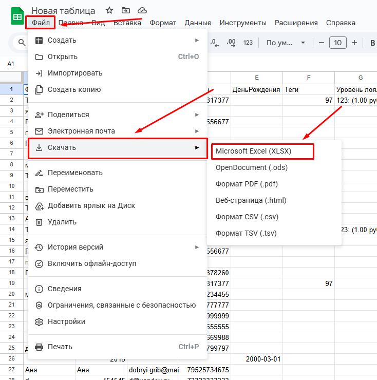 После выгрузки клиентской базы файл сохраняется в формате .csv — это универсальный формат таблиц, который обеспечивает корректное хранение данных. Если Excel открывает такой файл некорректно, таблицу можно преобразовать в удобный формат .xlsx.