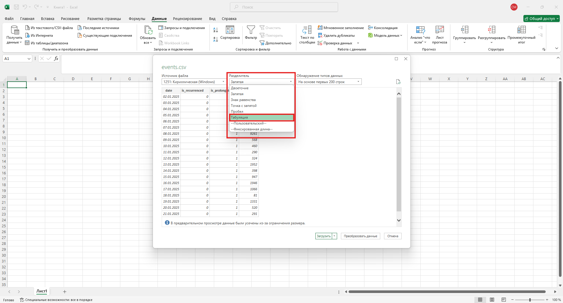 - В окне предпросмотра выберите разделитель Табуляция и нажмите Преобразовать данные.