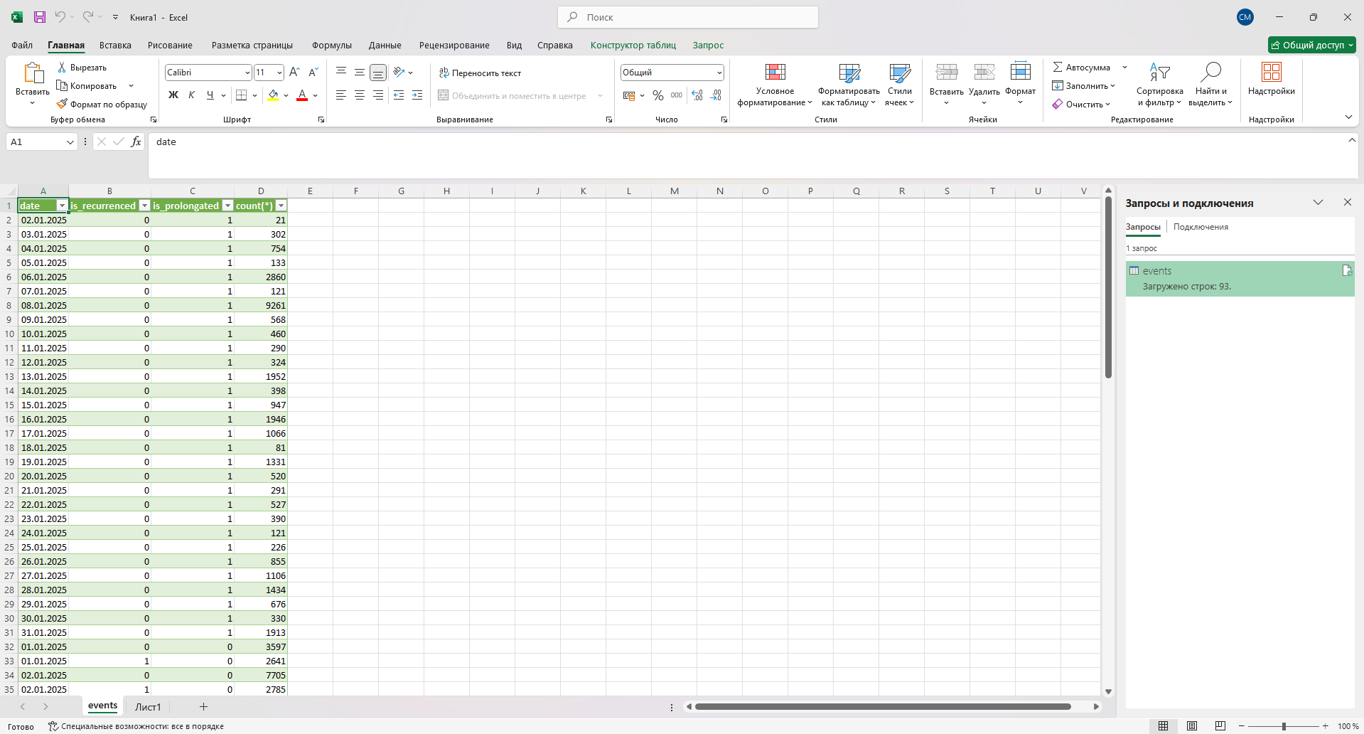 - Нажмите Закрыть и загрузить — таблица откроется в читаемом виде.