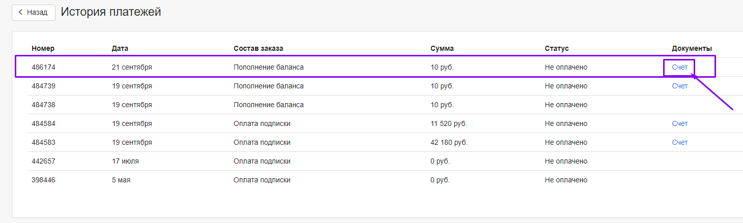 Нажмите «Запросить счет». Откроется страница «История платежей», и вверху страницы будет последний сформированный платеж.