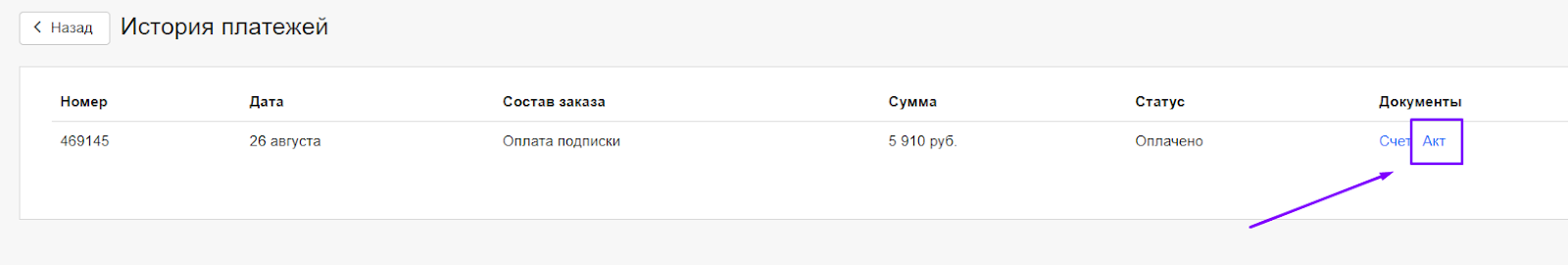 После успешной оплаты в этом же разделе, возле сгенерированного счета, автоматически будет подгружен «Акт», который также можно скачать.