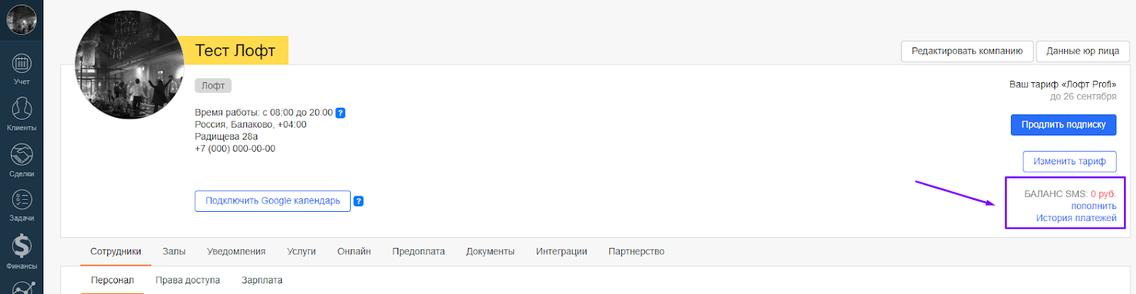 Баланс СМС — это счёт для оплаты СМС по тарифу оператора при настроенных уведомлениях в разделе «Профиль компании» - «Уведомления» - «SMS».