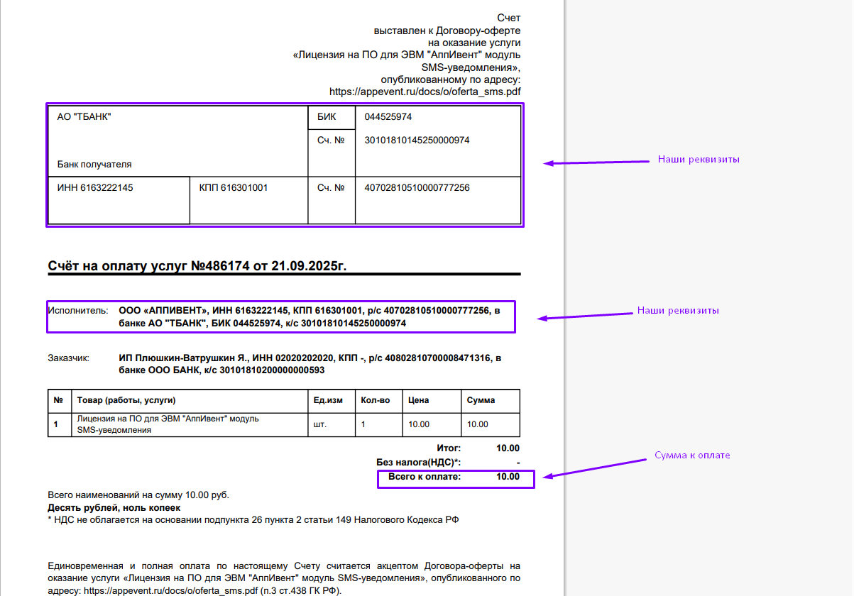 Обратите внимание, для корректного и правильного учета внесенной вами оплаты за услугу просим вас производить оплату строго по сформированному счету и тем реквизитам, которые в нем указаны.