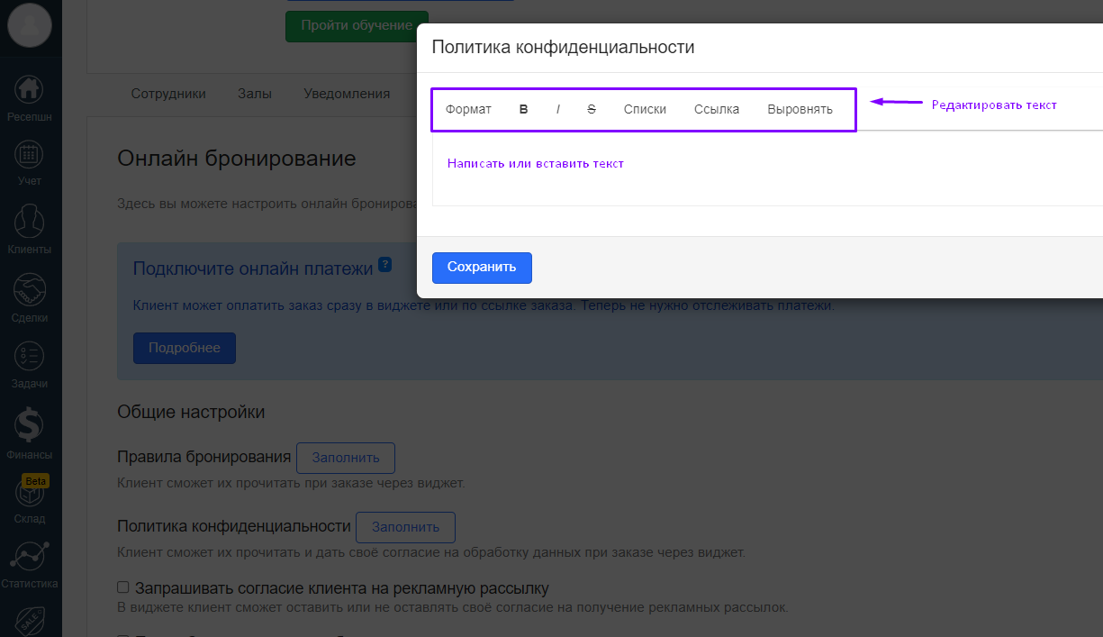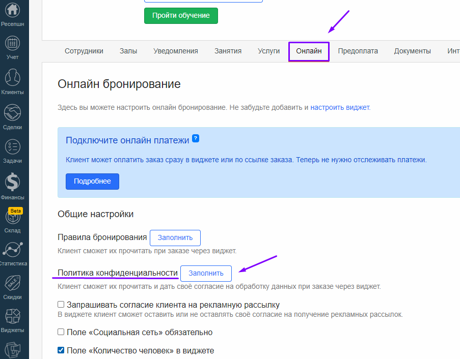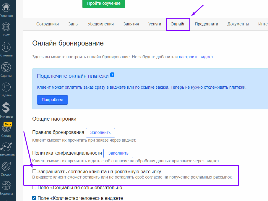 Общие настройки — «Запрашивать согласие клиента на рекламную рассылку» — нажать чекбокс (галку).