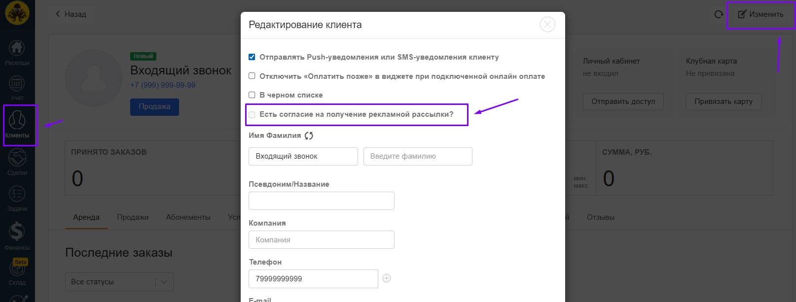 В карточке клиента по клавише "Изменить" есть поле "Есть согласие на получение рекламной рассылки?". Если галочка стоит, клиент дал согласие. Убрав галочку, система попросит снова предоставить согласие.